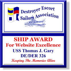 Welcome to the official U. S. S. Thomas J. Gary (DE/DER-326) Homepage. This page was started on 28 April 1997. I will continue to update it as new information is available. I apologize for any errors or omissions. Please bring them to my attention and I will correct them as soon as possible.